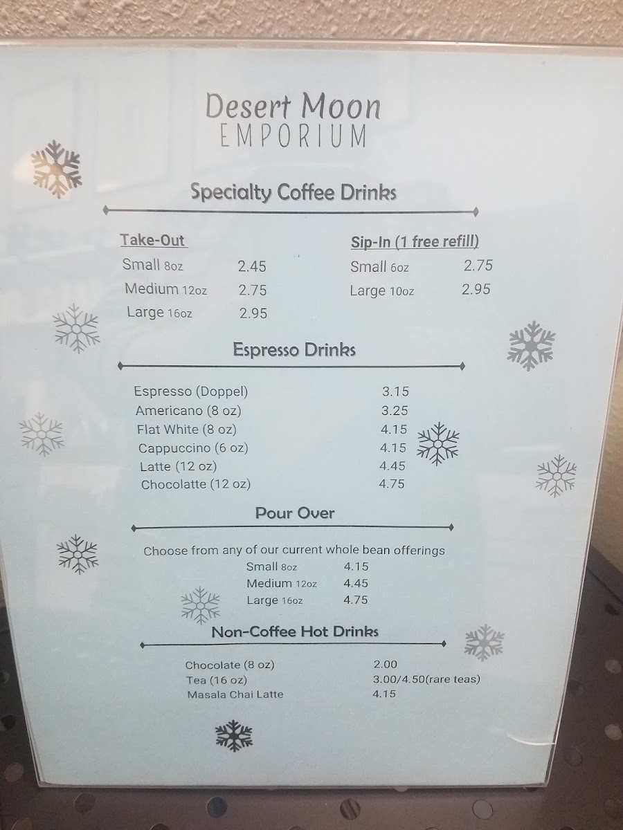 From savory appetizers to mouthwatering mains, every dish is thoughtfully crafted using fresh, locally sourced ingredients. You’ll find everything from comfort food with a twist to unique creations that reflect the vibrant culture of the region. Pair your meal with a refreshing drink, and you’ve got the perfect dining experience. Whether you’re a regular or a first-time visitor, there’s something for everyone at The Desert Moon Emporium. Come in, relax, and let the menu speak for itself!